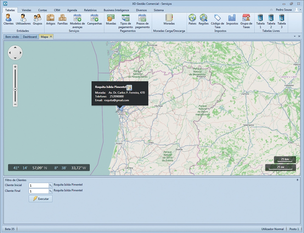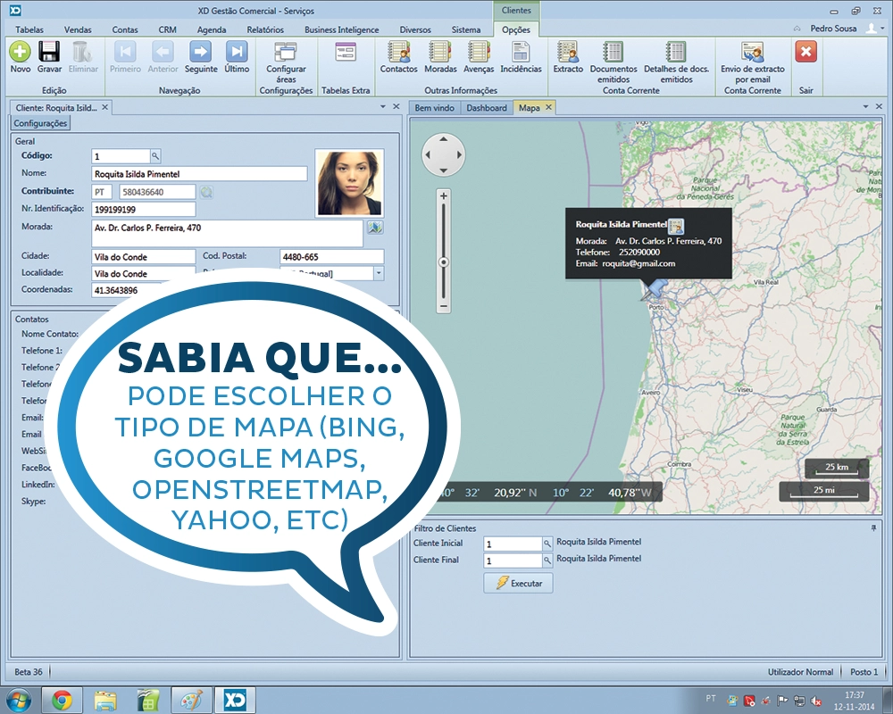 Por isso mesmo a partir do momento em que preenche a morada dos clientes tem disponível o mapa geográfico para sua orientação, podendo utilizar diversos filtros para uma pesquisa eficaz seja qual for o objetivo.