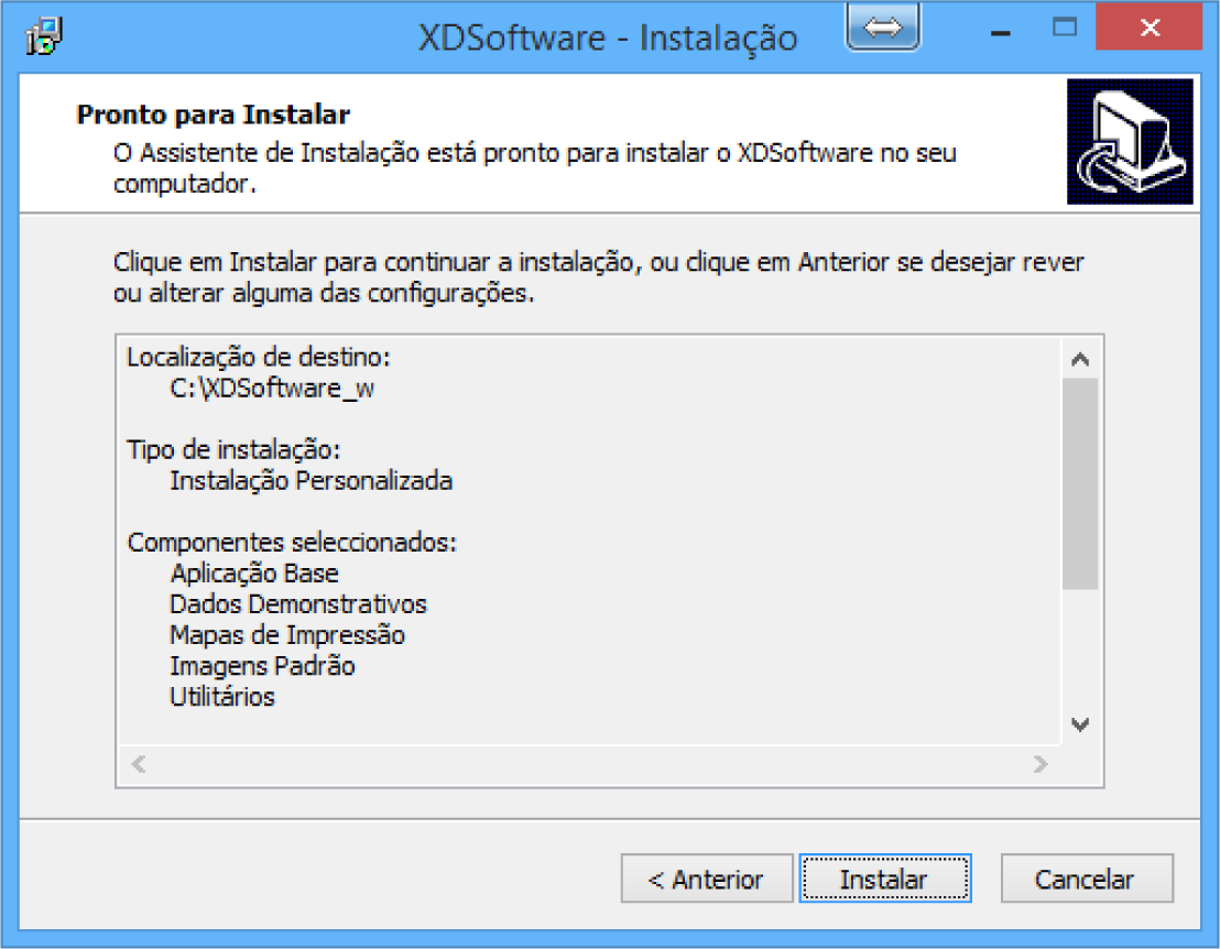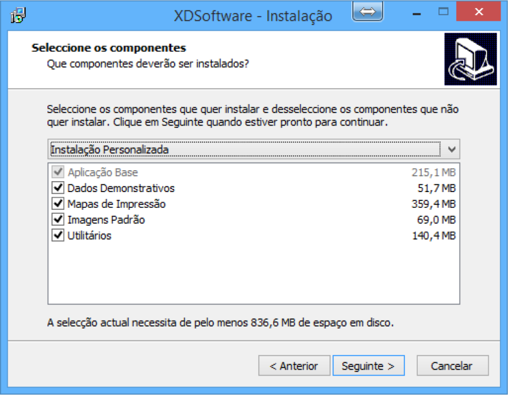 Esta é uma forma avançada de instalação pois pode optar por não instalar componentes fundamentais ao funcionamento do XD (por exemplo não efetuar a instalação das “Imagens Padrão” ou “Mapas de Impressão”)