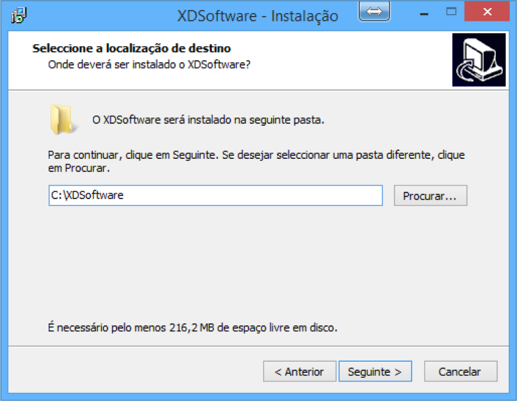 O próximo passo a definir é a localização para a instalação em que por padrão é sugerido “C:XDSoftware” . O XD pode ser instalado em drives diferentes (por exemplo F: ou G:) e o nome da pasta pode variar consoante a necessidade (por exemplo “C:XDSoftwareDEMO1”).