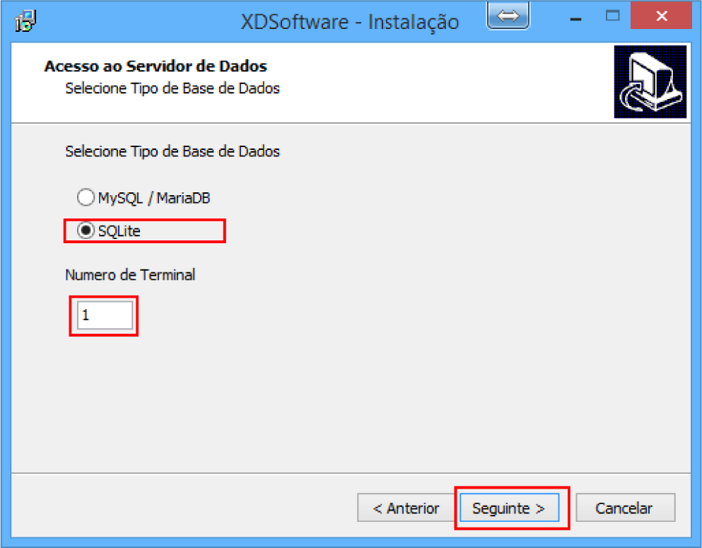 Neste ponto da instalção basta indicar a opção “SQLite”, indicar o numero de posto a utilizar (por padrão é 1) e pressionar na tecla Seguinte.