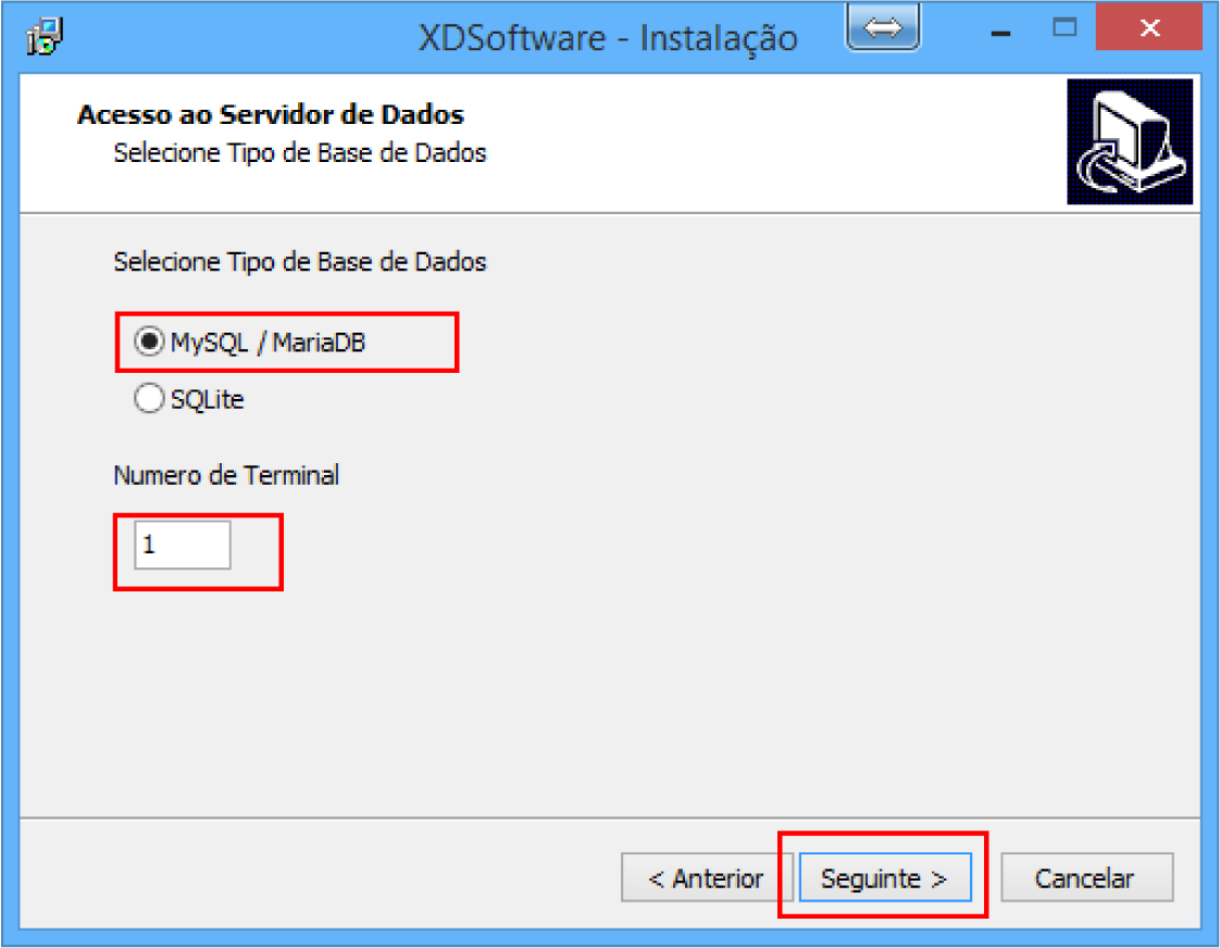 Neste ponto da instalação basta indicar a opção “MySQL / MariaDB”, indicar o numero de posto a utilizar (por padrão é 1) e pressionar na tecla Seguinte.