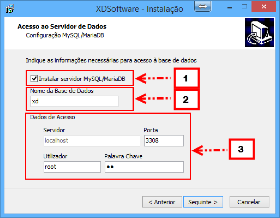 Por exemplo para uma instalação de servidor (ou monoposto), poderá marcar a opção “Instalar servidor MySQL/MariaDB” (ponto1) no caso de ainda não ter instalado, definir opcionalmente o nome da base de dados (por padrão é xd) (ponto2) e pressionar seguinte.