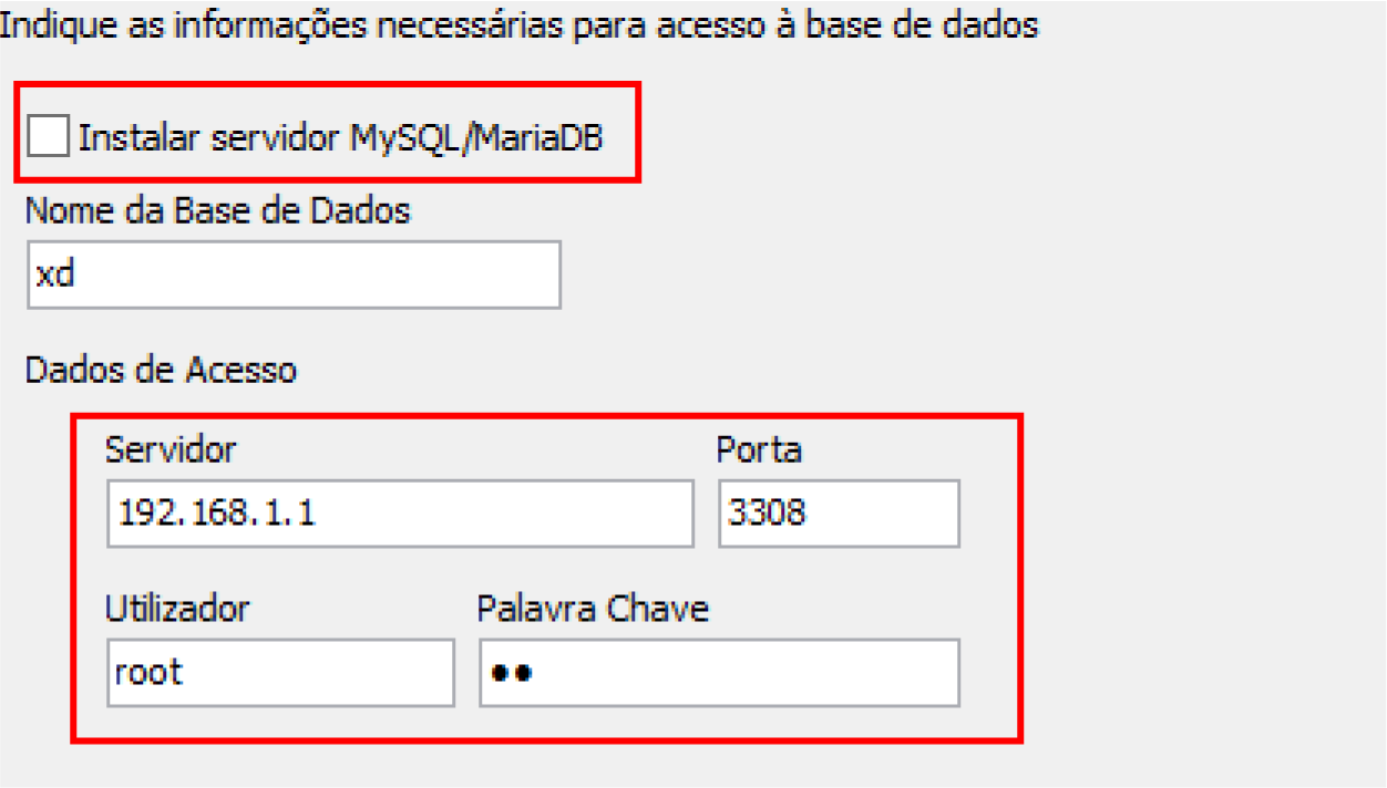 Nota Importante: O instalador não efetua qualquer teste de ligação ao MySQL. O instalador define apenas as configurações iniciais do XD. Se por exemplo introduzir os dados invalidados de acesso ao MySQL/MariaDB o XD não inicia por falta de acesso à base de dados. Neste pode definir manualmente os valores a partir do ficheiro “XDSoftwarecfgxd.ini”