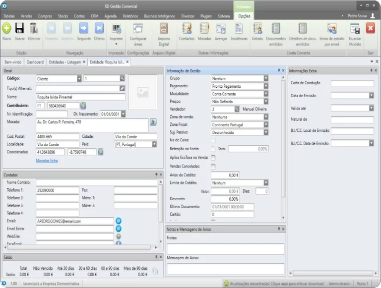 Criação de fichas de clientes detalhadas com suporte para múltiplos contactos e moradas.