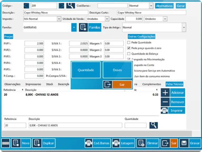 Gestão de stocks por ficha técnica.Configuração do stock a abater por dose, exemplo 1 garrafa de Vodka permite 14 doses.