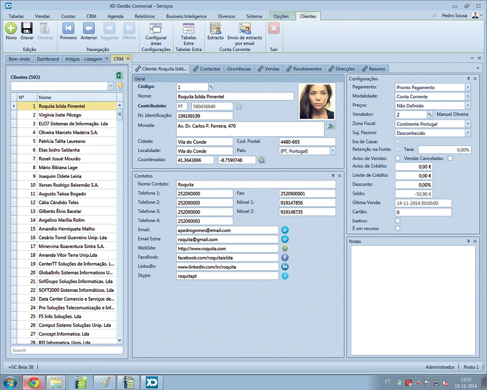 Logo de topo temos disponível todas as informações que necessitar, desde a simples ficha com todos os dados até ao resumo gráfico e numérico de vendas, passando pelos diversos contactos possíveis nos diversos departamentos do seu cliente, as ocorrências que tiveram lugar ao longo da parceria, as vendas e os recebimentos, e até a localização geográfica em mapa.